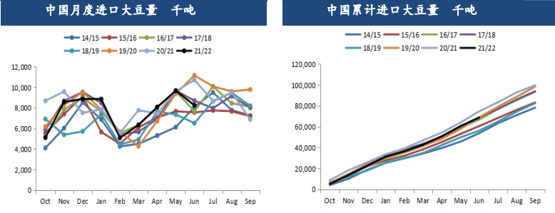 21/22年度我國累計進口大豆6884.4萬噸,上年度7475.3萬噸,同比降幅7.9%。去年10-11月我國進口大豆量偏少,而在12-2月,進口量略有回暖,從目前的進口數據來看,近3個月(7-9),中國每月平均進口大豆在800萬噸可達到USDA今年的預估,但目前9月仍有不少的采購缺口。