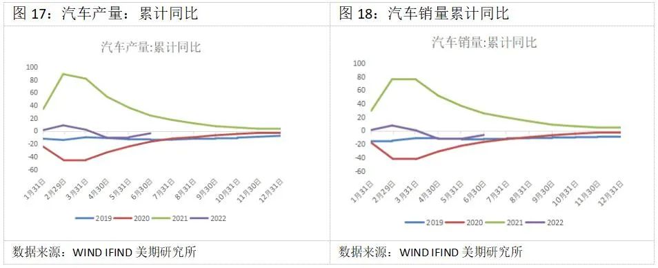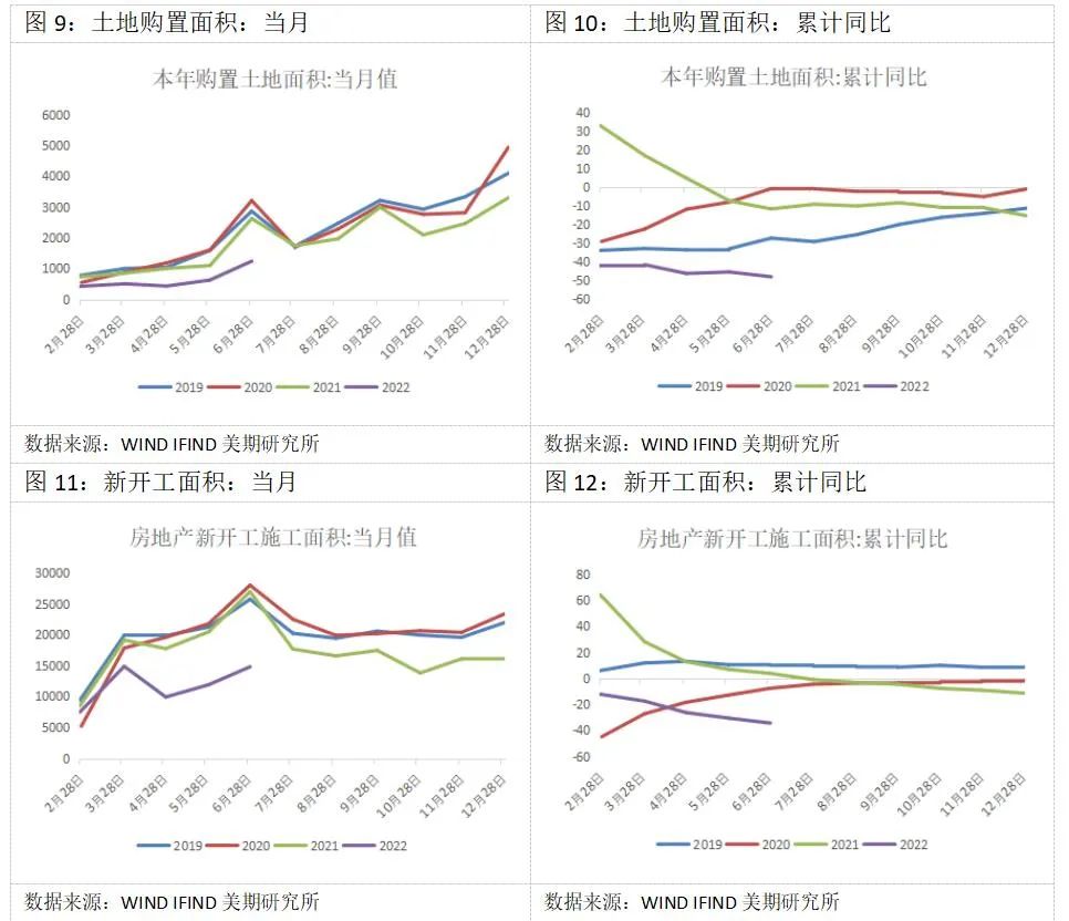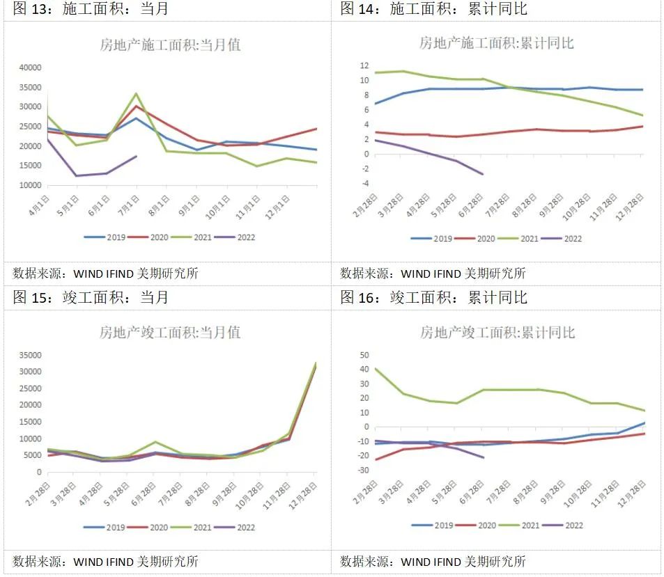 地產端來看,6月從拿地到開工竣工的各環節,數據均較5月有一定改善,但是參考近幾年的同期水平,仍有相當明顯明顯的差距,從累計同比數據上,土地購置-48.3%,新開工-34.4%,施工-2.8%,竣工-21.5%。其中前端數據降幅較大,而施工數據由于存量項目較多,從比例數值上看降幅不大,但也已經是近四年最低水平,考慮到前端拿地的降速高于后端竣工,后期地產需求仍難言樂觀。