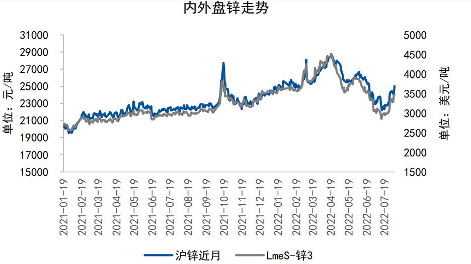 供給:7月精煉鋅產量為47.59萬噸;2022年1-6月,精煉鋅凈出口量為1.14萬噸,21年同期為凈進口42.9萬噸;國內鋅精礦產量為153.3萬金屬噸,累計同比降9.2%,礦進口量為181.73萬金屬噸,累計同比降3.12%。