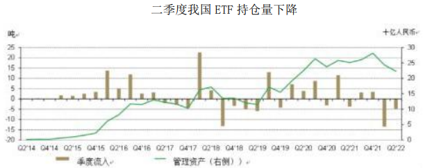 二季度中國黃金ETF總持倉量進一步下降,截至6月底僅為57噸。今年上半年,由于人民幣金價上漲,部分買家獲利離場,同時資本市場趨于穩定回暖,導致中國黃金ETF流出18.3噸。