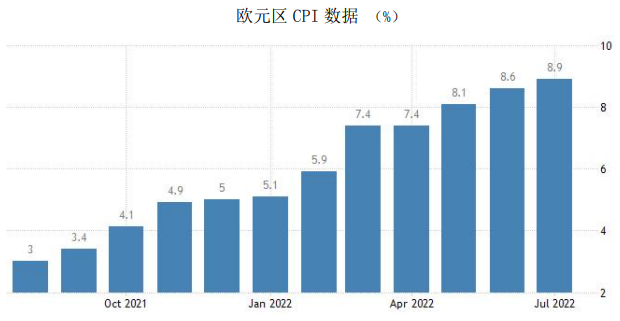 7月份歐元區消費者價格指數(CPI)較上年同期上漲8.9%,再度創下新高,高于上月的8.6%,再次受到能源和食品價格飆升的推動。