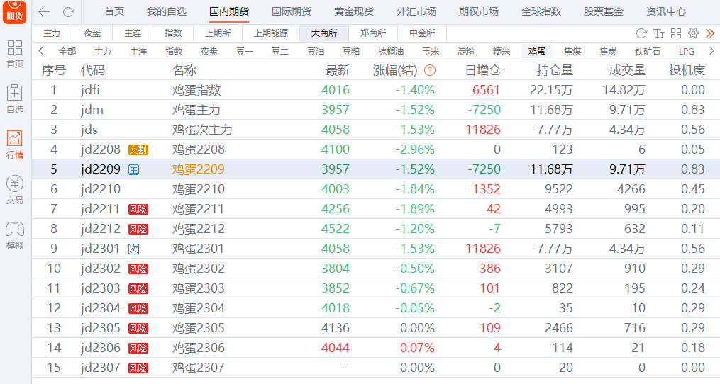8月9日,雞蛋2209合約資金凈流出6124萬元,收于3957,跌幅達到1.52%。近日雞蛋現貨價格繼續下調,雞蛋主力合約今日繼續中陰下跌,已經是7日連陰。