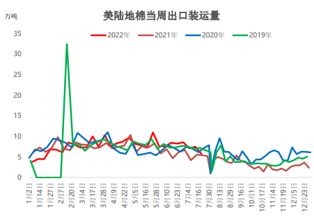 美棉出口方面,本年度美棉簽約銷售任務基本完成,但是裝運出口略顯滯后,新年度簽約量尚可。美國農業部報告顯示,2022年7月15-21日,2021/22年度美國陸地棉凈簽約量為-907噸,較前周和前四周平均值大幅下降,創本年度新低。截至當周累計簽約2022/23年度棉花107.88萬噸。