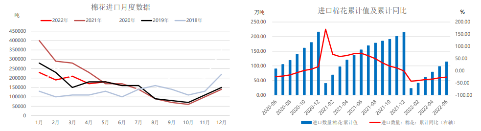 據海關統計,6月份國內進口棉花16萬噸,創下年內新低。1-6月份進口棉花114萬噸,同比下降26.1%。