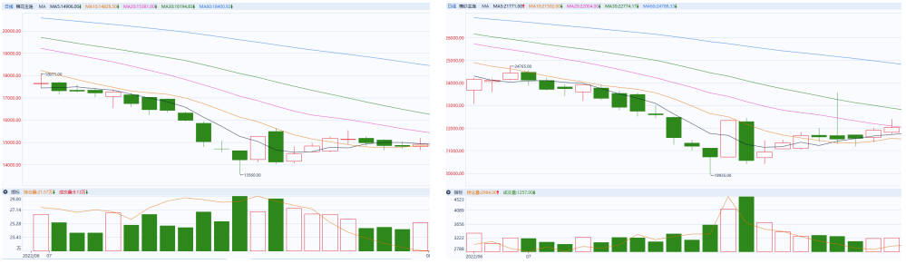 7月份鄭棉鄭紗呈現弱勢震蕩下跌格局。7月29日鄭棉收報14920元/噸,較月初下跌2735元/噸,跌幅15.49%。收報22025元/噸,較月初下跌2425元/噸,跌幅9.92%。