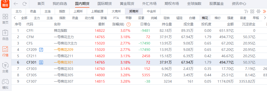 8月11日,棉花301合約資金1.85億元,收于14765,漲幅達到3.18%。美棉種植區受天氣影響引發市場擔憂,國內純棉紗現貨市場走貨好轉,棉花主力合約今日底部中陽反彈。