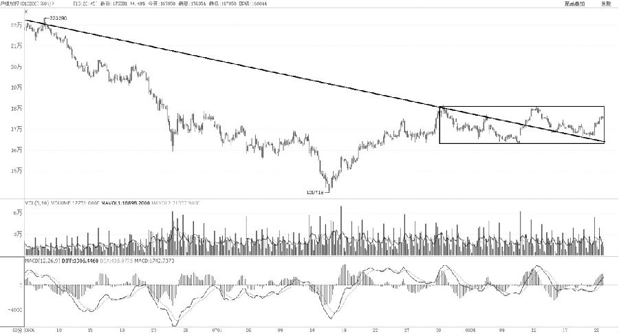 前期,滬鎳價格實現了最高點調整以來的趨勢反轉,再創新低已是小概率事件。可是,近期滬鎳再度弱勢,直至昨日再收放量大陽線。從技術上來看,昨日的陽線依然沒有突破180000元/噸整數關口,只是受到165000元/噸的短支撐。同時,成功回踩趨勢線后價格回歸,還不能確認第二輪反彈是否開始。不過,日MACD已經回歸至零軸上方,紅柱有再度放大的趨勢。因此,滬鎳向上突破是大概率事件。