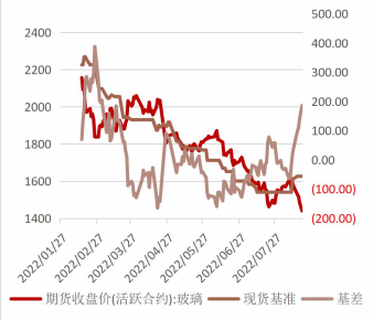 圖一:玻璃期現價格與基差(元/噸)
