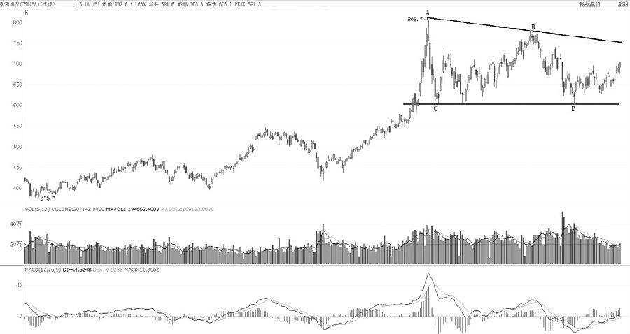 玻璃期貨經過一個月的底部振蕩后,周MACD在支撐位上方形成了底背離形態,價格實現止跌,在技術上得到了確認。是否能夠實現趨勢反轉,關鍵要看價格能否站上A高點和B高點組成的空頭趨勢線。至于反彈高度,目前依據不足,預估回升至1800元/噸。(開元貿易 顧敏忠)