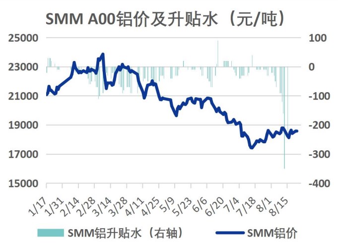 8月23日SMMA00電解鋁現貨均價18570元/噸,跌10;平水。華東地區鋁錠現貨升貼水持穩,較2209合約價格仍報平水,無地區市場成交較SMMA00價格均價出貨;中原鞏義地區,較SMMA00均價貼水120元/噸,較前一日小幅擴大10元/噸。