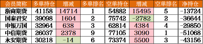 總體而言,今日玻璃FG301合約多空排名前20席空單增倉量高于多單,其中多、空排名前3的席位均持有凈空單,另外,長期持有凈多單的東證期貨在價格下跌中減多加空,于今日轉變為持有凈空單。