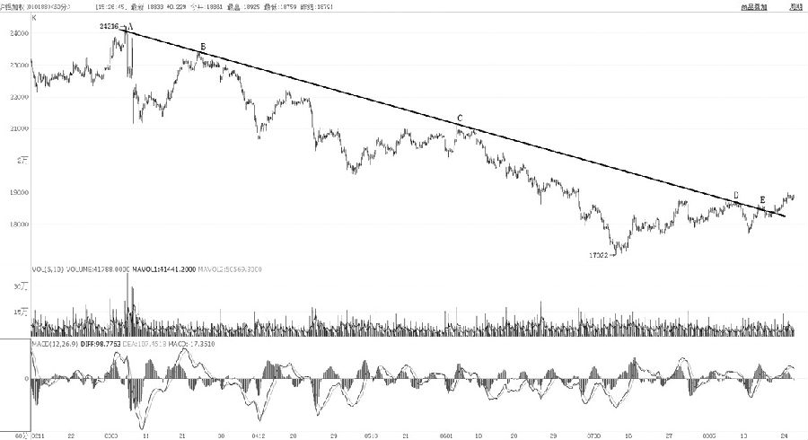 3月以來滬鋁進入回調,在小時級別K線上,可以定義出由A、B、C三個重要高點組成的趨勢線。在滬鋁的首輪觸底反彈中的高點D,明顯受制于上方壓力線,隨后再次探底回升,又在壓力線E點位置反復膠著。D高點和E位置的波動情況,再次證明了趨勢線的有效性,故本周滬鋁多頭實現了真正的突破。后市滬鋁進入第二輪反彈,預計目標在19000—20000元/噸之間。