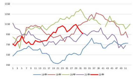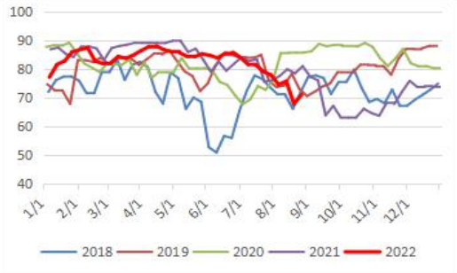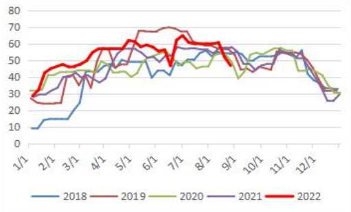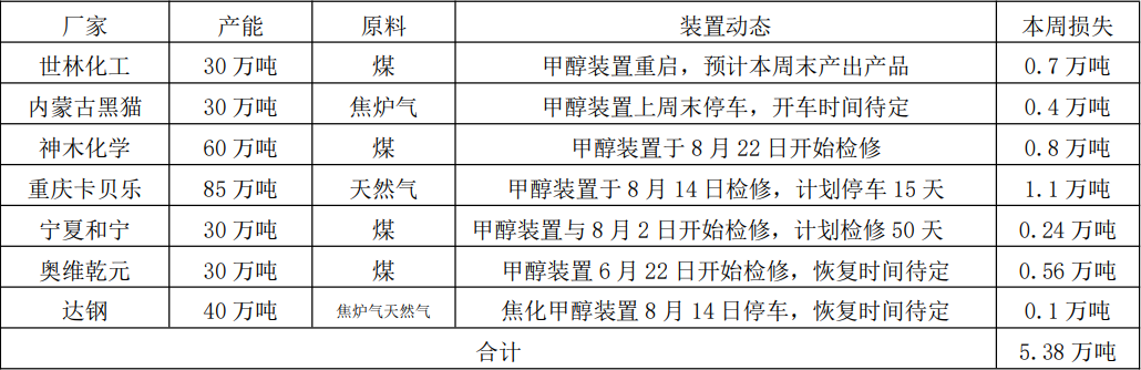2、供應端:截至8月26日,煤制甲醇裝置開工負荷65.91(-0.43)%,天然氣制甲醇周度開工率為46.96(-5.09)%,焦爐氣制甲醇裝置開工率60.03(+0.11)%,本周煤制甲醇裝置開工率繼續回落,同時由于四川限電影響天然氣制甲醇裝置開工率繼續回落。