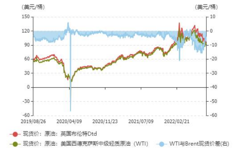 截止至2022年08月25日,當日WTI原油現貨價格為92.52美元/桶,與上一日比下跌2.37美元/桶;Brent原油現貨價格為100.1美元/桶,與上一日比增加1.07美元/桶;WTI與Brent現貨價差為-7.58美元/桶,與上一日比下跌3.44美元/桶。