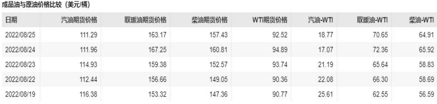 截止至2022年08月25日,NYMEX汽油期貨的收盤價為2.65美元/加侖(折合111.29美元/桶),與上一日比下跌0.02美元/加侖,汽油期貨與WTI原油的價差為18.77美元/桶,價差處于歷史較低水平。