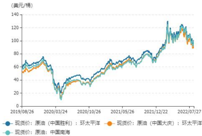 截止至2022年08月24日,大慶油田原油現貨價格為94.11美元/桶,與上一日比上漲3.09美元/桶;勝利油田原油現貨價格為101.24美元/桶,與上一日比上漲3.07美元/桶;中國南海原油現貨價格為99.61美元/桶,與上一日比上漲3.08美元/桶。
