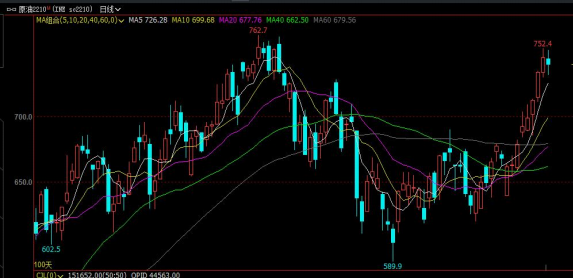 期貨合約周內偏強震蕩,截止本周五主力合約SC2210周五收盤價740.0元/噸,漲幅6.98%,最高價752.4元/噸,最低價686.0元/噸,成交量為85.51萬手,持倉量為4.46萬手,日增倉-2860手。