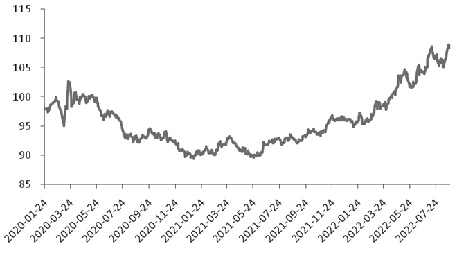 近期人民幣匯率出現一定程度貶值,一方面是在美聯儲繼續緊縮的背景下,美元指數走勢較強,29日盤中突破109,創2002年以來新高,另一方面國內降息,使人民幣匯率承壓。未來在美聯儲政策明顯轉向之前,美元指數將保持強勢。