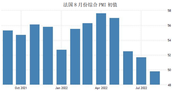 法國8月份綜合PMI初值錄得49.8,低于7月份的51.7。服務業PMI初值錄得48.2,創16個月新低,制造業PMI初值錄得49,創18個月低點。