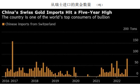 中國從主要煉制中心瑞士進口的黃金數量躍升至5年多來的最高水平,表明隨著中國放松對新冠肺炎的嚴格措施,需求有所改善。