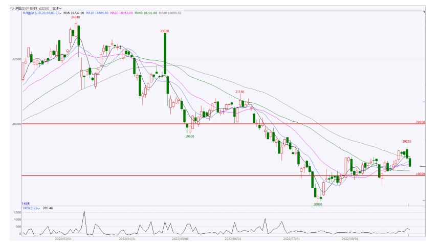 庫存方面,社會庫存微幅累庫影響偏中性。目前盤面受外部因素擾動影響較大,建議單邊投機回避,空近月多遠月的跨期套利組合可繼續持有,需關注限電以及歐洲事態的進一步發展,短期盤面區間震蕩。主力合約上方壓力位20000,下方第一支撐位18000。