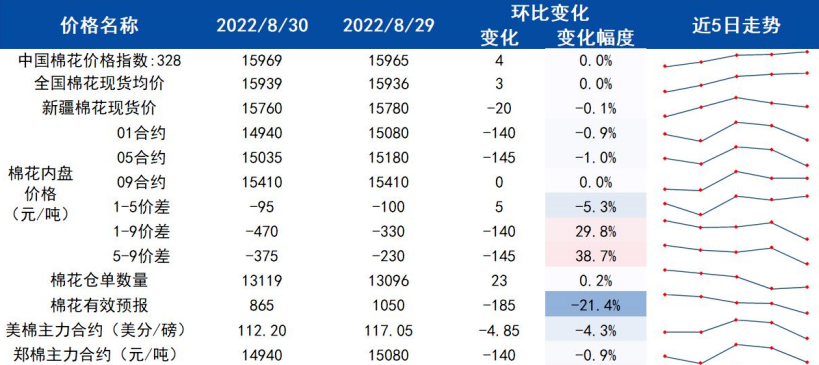 國內宏觀數據相對穩定,消費需求偏弱,邊際出現小幅好轉跡象,但是和旺季水平相距甚遠,棉價跟隨外棉震蕩,近期關注金九銀十帶來的內需增量。新疆棉目前成熟度較高,關注新棉采摘進度。