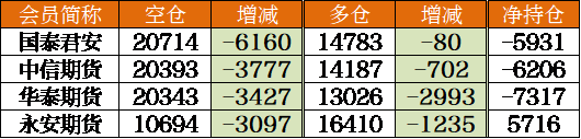 前20席期貨公司持倉數據顯示,今日多倉減少16881手至197177手,空倉減少16669手至222475手,整體持有凈空單25298手。