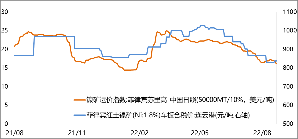 截止2022年9月2日,品位1.8%菲律賓紅土鎳礦運至的車板含稅價為837元/噸,較上周+8元/噸。(車板含稅價,指將貨物送到發運地火車站(港口)列車或者船只上的含稅的交貨價格。)