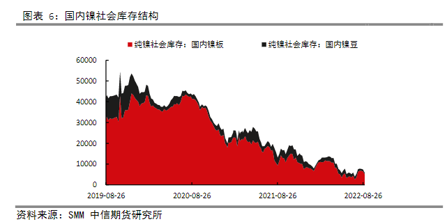 而國內社會庫存來看,庫存占據主導的是鎳板,占比基本保持在85-90%左右,鎳豆庫存較少。