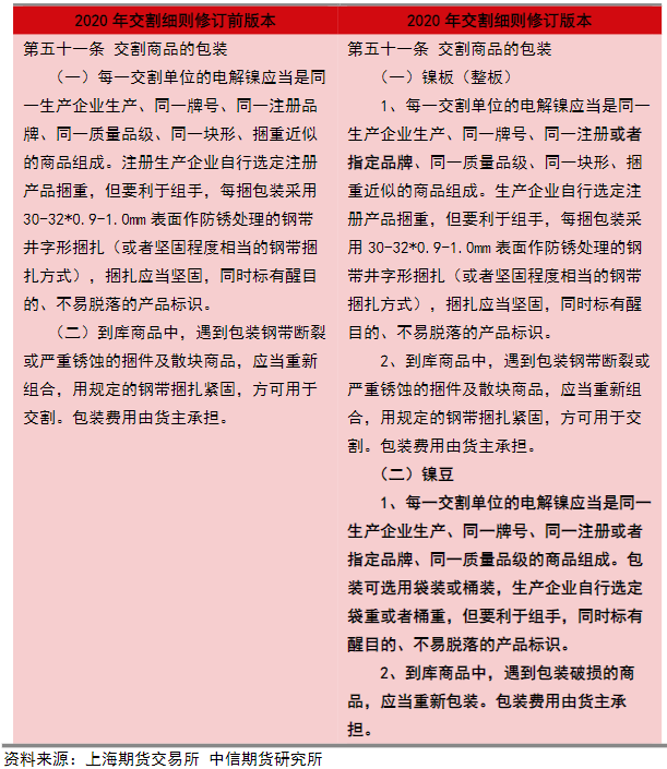 2015-2020年間,上期所鎳期貨合約僅有鎳板可進行交割,后于2020年5月發布《上海期貨交易所鎳期貨合約(修訂案)》及《上海期貨交易所交割細則(修訂案)》,本次修訂取消對參與實物交割的電解鎳的形狀限制,允許其他形狀的電解鎳參與實物交割,同時豐富鎳期貨交割商品準入機制,在保留品牌注冊制的基礎上,增加品牌認可制。并發布公告確認鎳豆從NI2011合約起納入交割,但暫未對可交割品牌,及交割升貼水等進行詳細規定,鎳豆并未在后續實質進入交割用。