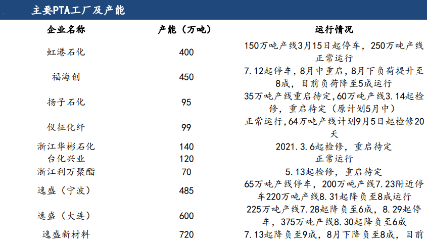 目前來看,9月新增的檢修計劃仍然較多,疊加部分2季度停車至今的裝置。按已經官宣的PTA裝置檢修,預估9月檢修損失量156萬噸,供應相對充足,而海南逸盛及恒力石化2#裝置如果進入檢修,PTA將再度供不應求,去庫行情延續。