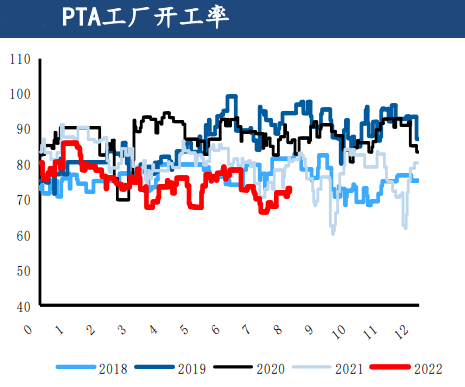 從PTA供應端來看,8月份PTA開工率維持低位,社會庫存從8月初的233萬噸去庫至201.6萬噸后,維持去庫行情。
