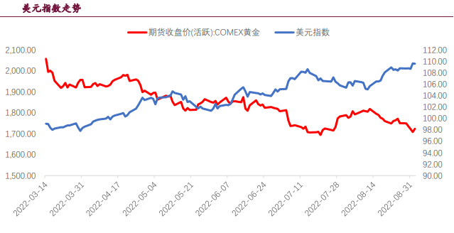 上周五公布8月美國非農就業數據,數據整體并沒有延續7月份的強勁。非農新增人數錄得31.5萬,預期30.0萬,前值52.6萬;失業率由7月的3.5%上升至3.7%。非農就業公布后,市場加息預期有所下降,美元指數小幅回落,紐約金反彈近10美元。