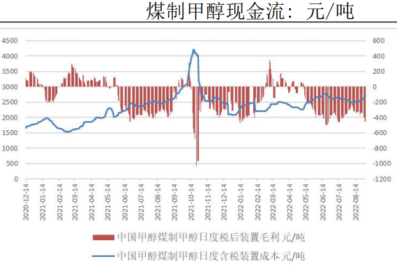 截至8月31日,國內煤制甲醇含稅裝置成本2730元/噸,相對7月底上漲145元/噸,煤制甲醇裝置毛利潤-450元/噸,相對7月底小幅下跌102元/噸,本月煤炭價格重心回升,但甲醇價格相對表現偏弱,甲醇利潤月內再度回落。