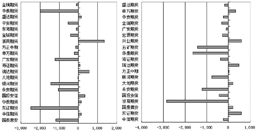 空頭前20席位中,減持空單的有13家。減持空單數量超過1500手的有2家,分別為浙商期貨席位和華泰期貨席位,分別大幅減少2844手和1642手。另外,減持空單數量介于500手至1500手之間的有3家,分別為永安期貨席位、銀河期貨席位和五礦期貨席位,分別減少1209手、776手和1420手。剩余8家減持不足500手。