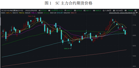 期貨合約周內大幅下跌,截止本周五主力合約SC2210收盤價672.0元/噸,跌幅3.27%,最高價715.4元/噸,最低價661.1元/噸,成交量為58.96萬手,持倉量為1.84萬手,日增倉-15339手。