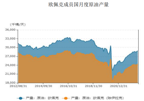 截止至2022年07月,當月歐佩克月度原油產量合計為28,896千桶/天,較上月增加216千桶/天。
