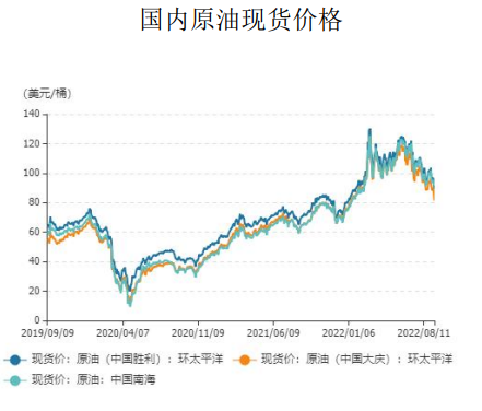 截止至2022年09月08日,大慶油田原油現貨價格為81.56美元/桶,與上一日比下跌4.68美元/桶;勝利油田原油現貨價格為88.66美元/桶,與上一日比下跌4.85美元/桶;中國南海原油現貨價格為91.63美元/桶,與上一日比下跌3.25美元/桶。