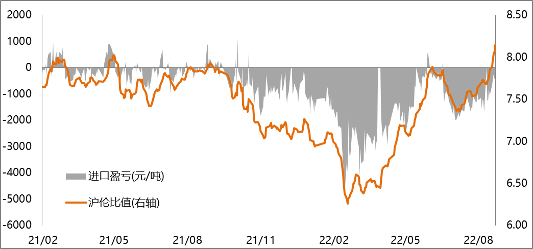 截止2022年9月9日當周滬倫比值平均為8.14,上周為7.85;