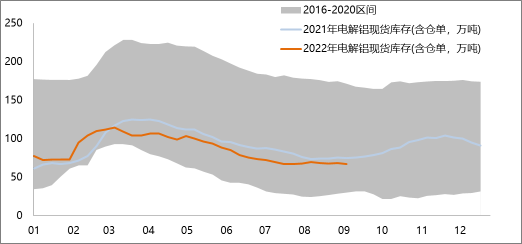 截止2022年9月9日電解鋁社會庫存(含倉單)為67.2萬噸,較上周四減少1.1噸;