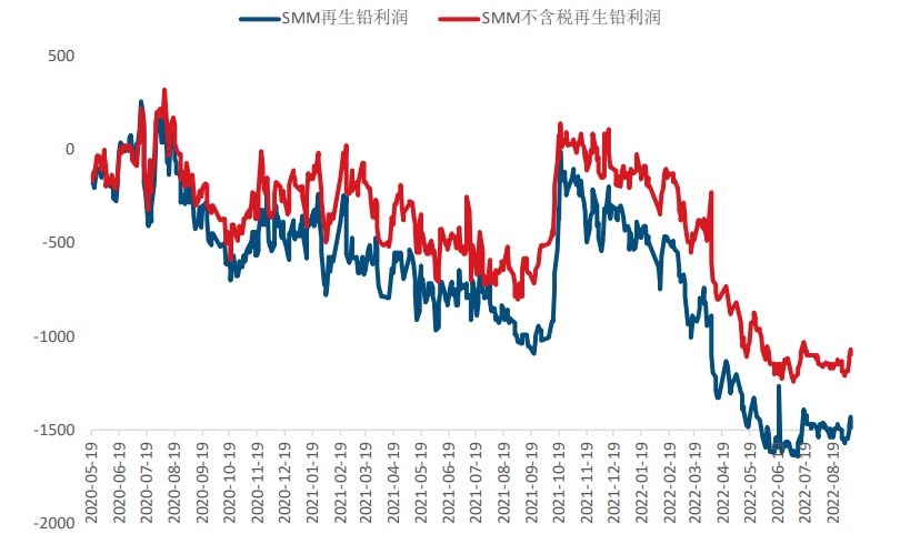 國內再生鉛維持在低位,再生鉛利潤單噸虧處在1500元左右,再生鉛利潤導致再生投產意愿價差,對鉛而言,短期供應壓力不大,持續平軟的再生利潤對價格形成一定成本支撐。
