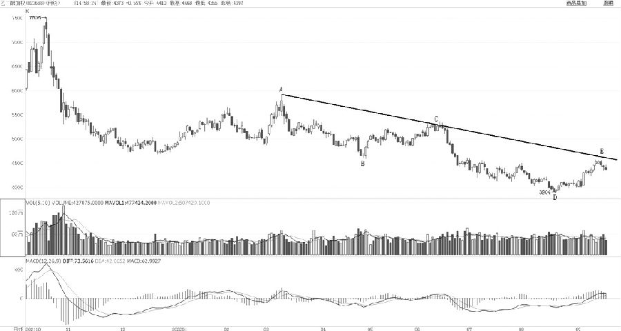 乙二醇從去年最高位進入熊市調整以來,經歷了三大下跌浪,第三大浪是由A點、C點和E點三個次級別高點組成。其中,A—B點和C—D點兩個下跌階段形成等幅結構,這是乙二醇在4000元/噸位置止跌反彈的原因之一。周線級MACD上,目前已經形成低位鈍化和金叉形態,紅柱出現放大趨勢,有助于多頭進入反彈周期。不過,隨著第一輪反彈遇到上方壓力,短線不宜追高,再次入場需重新等待機會。